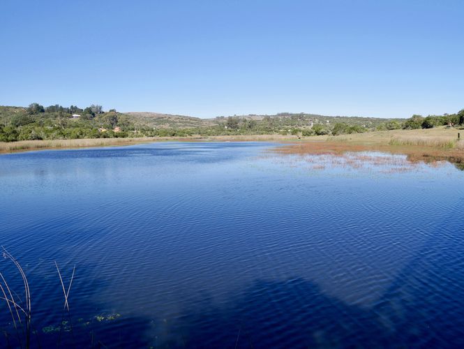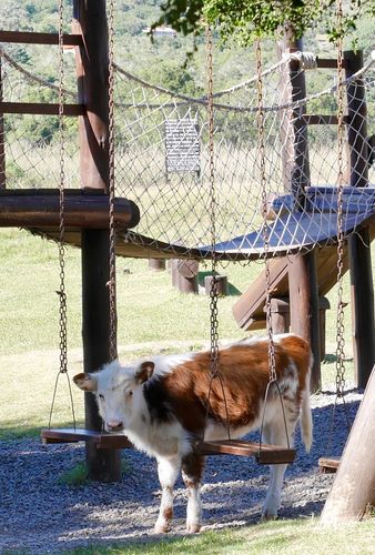 Je rebrousse chemin, en quittant le parc et en revenant sur mes pas jusqu'à la Ruta 8, tourne à droite (en direction de Treinta y Tres), puis tourne à nouveau à droite quelques kilomètres plus loin lorsqu'un panneau routier indique « Villa Serrana ». Je m'engage ainsi sur une piste de terre en mauvais état et pénètre ainsi dans cette réserve foncière qui fut concédée par le gouverneur de Montevideo à Francisco Perez Fontan, en 1769. Le 16 avril 1945 était constituée la société anonyme Villa Serrana avec pour objectif de bâtir des villas résidentielles avec vue imprenable sur la nature. C'est l'architecte Juan Vilamajo qui se verra confier la conception des maisons, dont une, Ventorillo Buena Vista (ci-dessous), reste aujourd'hui l'un des joyaux du site. Pour ce faire, notre homme fit appel à plusieurs paysagistes du monde entier et construisit des maisons faites des matériaux locaux comme la pierre, le bois et le chaume. Et Villa Serrana d'être conçu comme un endroit préservé du tumulte des villes environnantes. Une résidente italienne interrogée sur place se qualifiait d'ailleurs de « survivante » au milieu d'une nature luxuriante. Il est vrai que, sur place, les rues portent par exemple des noms d'arbres, et que de sages maximes sont affichées en espagnol ici et là dans les jardins. Une autre philosophie de vie. Les arbres qui furent plantés dans cette grande propriété seront choisis avec soin, pour leurs couleurs notamment. 100 000 arbres seront ainsi plantés les premières années de la création de la Villa Serrana, avec obligation pour les propriétaires de conserver les espèces naturelles. Sept quartiers furent aussi créés, avec, toujours le souci de préserver la nature tout en y développant des attractions. Ainsi découvrirai-je un peu plus bas que la maison Ventorillo, un petit lac (deuxième photo) avec, sur sa rive, des balançoires semblant beaucoup amuser un petit veau en liberté (troisième photo). Ce lac artificiel dénommé Enrique Stewart Vargas (en hommage au dessinateur du projet), fut creusé en 1958 sur le cours d'eau Miraflores dont les eaux sont retenues par un petit barrage.