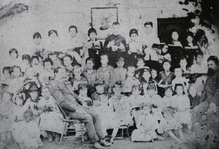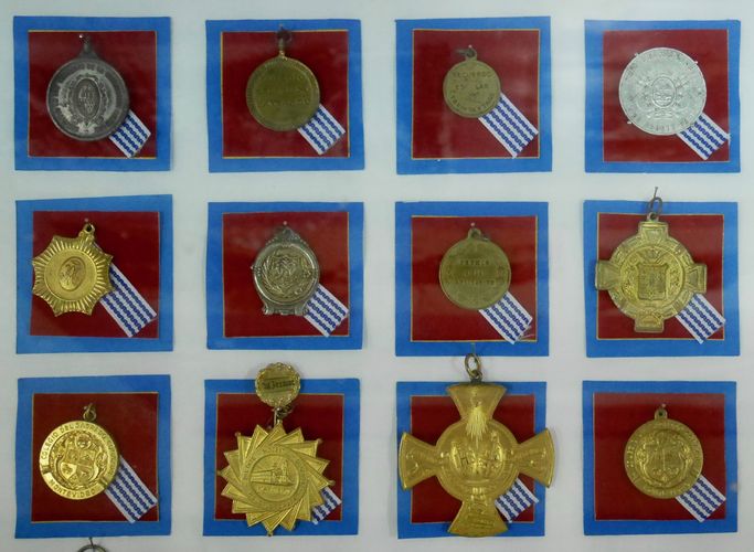 L'école avait trouvé sa place à Rivera dès 1866, avec l'aide du maitre José V.Asplanato qui rassemblait déjà dans sa classe trente élèves garçons dès 1867. 1868 vit la création d'une école pour filles, puis une seule école fut instituée deux ans plus tard, qui rassemblait filles et garçons (ci-dessous, une photo datant de 1890), et il fut même créé cette année-là une école trilingue (première institution éducative privée à l'époque) qui enseigna aux élèves en portugais, espagnol et français. Le Collège San Luis Gonzagua naquit en 1894, en tant que collège privé catholique. Un an plus tard, une autre école, élémentaire celle-là, apparut et rassembla soixante élèves, avant que, peu de temps après n'apparaisse l'Institut français qui dispensa des cours de commerce et de comptabilité. En 1900, Rivera comptait ainsi pas moins de six écoles publiques (avec 536 élèves) et deux écoles privées (42 élèves). Comment, après cela, s'étonner de la moisson de médailles (deuxième photo) que les petites élèves âgés de 6 à 12 ans pouvaient récolter suite à leurs excellents résultats ?