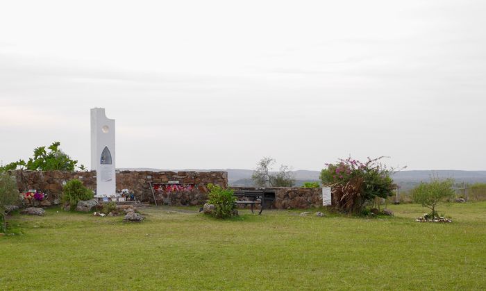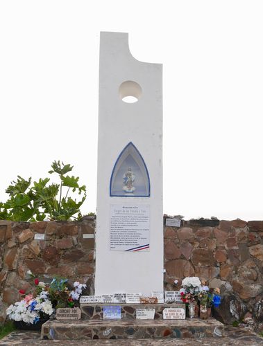 J'arrive bientôt au bout de la piste après avoir croisé de gros chiens agressifs qui aboyèrent et coururent après mon véhicule. Le sanctuaire de la Vierge des 33 Orientaux (du nom de ces combattants qui se battirent en faveur de l'indépendance du pays) ressemble à un petit parc gazonné avec des bancs qui invitent à la méditation (photo ci-dessous). L'endroit est au milieu de nulle part et on peut admirer le paysage lointain (ci-dessous, deuxième photo) car ce lieu domine les environs. Aux abords du parc, sur ma gauche se trouvent deux petites niches, l'une d'entre elles étant consacrée à la Vierge noire. Un petit tourniquet m'autorise l'entrée dans le parc et je distingue très vite le monument en l'honneur de cette vierge patronne des Uruguayens (troisième photo). Il y a quelque chose d'incroyable dans la croyance en la Vierge qu'ont placé les habitants de ce pays, et aussi un concours de circonstances : le 14 juin 1825, à la suite de la croisade de libération de l'Uruguay, les patriotes se trouvaient à Florida pour célébrer leur congrès. Et le 25 août de cette même année, ce congrès de déclarer l'indépendance de la province orientale d'Uruguay et son union avec les Provinces Unies du Rio de La Plata. Personne n'avait à cet instant remarqué qu'à côté du ranch où se tenait le fameux congrès, se trouvait au même instant une image de la Vierge. Une image de petite taille certes, image taillée dans le bois et d'origine guarani, datant du XVIII ème siècle et qui avait été confiée à un certain Antonio Diaz, un Indien de Santo Domingo de Soriano. Certains virent sans doute une intervention divine dans la fin heureuse du congrès et la Vierge d'être depuis vénérée dans la cathédrale de Florida (capitale du département uruguayen).