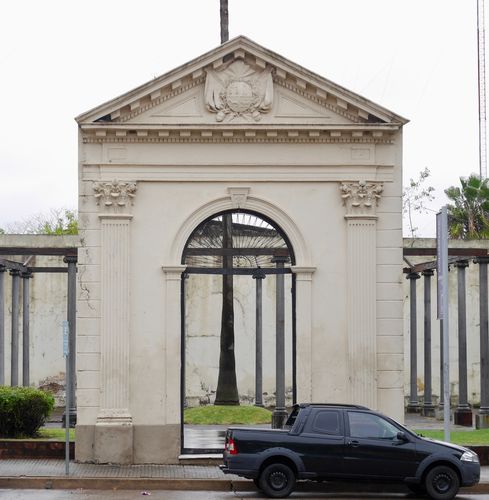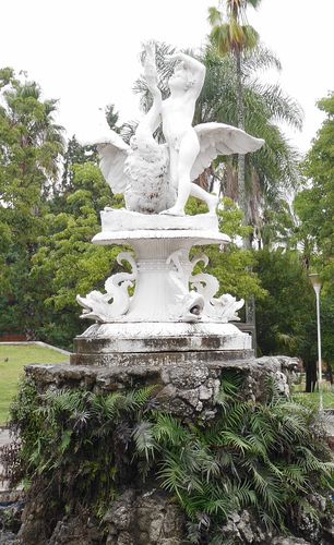 Une autre place, la Plaza Treinta y Tres se trouve aussi sur la rue Uruguay, mais un peu plus bas. Une des places principales de Salto, celle-ci est la plus ancienne de toutes et permet d'admirer en son centre une magnifique fontaine ornée d'un ange et d'un cygne (ci-dessous), qui fut construite en 1870 et recouverte d'agates et de cristaux, nombreux dans ce département. D'autres sculptures sont placées ici ou là le long des allées. En 1974, lors de travaux de restauration de l'endroit, les bustes du général Don Manuel Oribe et du général Juan Antonio Lavalleja ont été rajoutés. Dois-je rappeler que ces deux hommes furent des héros de la croisade de la Liberté des 33 Orientaux. Donnant sur cette place, l'ancien commissariat de police (bâti en 1861 par Antonio Invernizzi) n'existe plus depuis fort longtemps. Il reste toutefois son portail (deuxième photo), appelé Columnata, joliment restauré, et un plan de délimitation de l'ancienne bâtisse tracé avec goût.