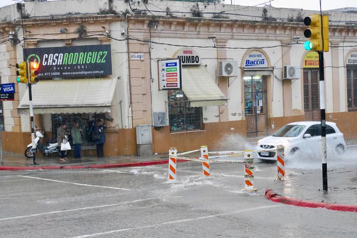 Triste journée que ce vendredi. A mon départ d'Artigas, il avait déjà plu. Et il tombera des cordes à Salto. Je roulerai à bonne vitesse durant ces deux heures de route, avec une qualité de route irrégulière. Oui, c'est l'irrégularité qui prime dans ce pays. Ainsi, roulerai-je sur une route bien bitumée et, soudain, je traverserai trois cents mètres de route avec des trous et des rapiéçages de goudron. Puis une portion de deux kilomètres en terre (très glissante avec la pluie) et retour à une route normale. J'ai toutefois l'impression que le réseau routier du département de Salto est quand même meilleur que sur Artigas. Une exception, l'entrée dans la ville de Salto, par la porte de la Prudence. Cela ne s'invente pas, et, compte tenu du nombre de trous et de flaques d'eau garnissant la chaussée, mieux vaut l'être....prudent ! Comme d’habitude, je me gare sur le bas-côté et demande mon chemin à un passant. Je ne mettrai pas longtemps à trouver mon hôtel, mais je serai contraint de me garer dans une rue adjacente, alors que la pluie se remet à tomber. Après mon arrivée à l'hôtel, ce fut le déluge, une grosse pluie d'orage qui ne tarda pas à transformer la rue en...Rio Grande (ci-dessous). De gros ruisseaux s'étant formés le long des trottoirs, il est alors impossible de traverser une rue sans inonder ses chaussures. Les habitants, eux, connaissent la chanson et se sont mis à l'abri devant des devantures de magasins ou sous des porches d'immeubles.