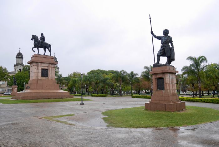 Une accalmie se profilant à l'horizon, j'en profite pour partir à la découverte de la ville : la Place Artigas (ci-dessous) brille d'élégance avec la statue équestre du général José Artigas, œuvre du sculpteur Edmundo Pratti qui y fut installée lors du centenaire du serment de la Constitution de l'Uruguay. Le monument fut inauguré le 29 septembre 1940. De chaque côté de cette statue équestre se dressent une statue, celle du paysan et du citadin. Jadis, cette place portait le nom de Plaza Nueva, puis plus tard, Plaza 18 de Julio. Pour prendre enfin le nom de Plaza Artigas il y a 62 ans. Sur cette même place se dresse la cathédrale Saint Jean-Baptiste (deuxième photo). Sa construction débuta au début du XIX ème siècle puis fut terminée en plusieurs étapes au cours du XX ème. Ici même s'éleva autrefois une première église à l'époque de l'exode de la population orientale en 1811. L'intérieur de l'édifice offre d'admirer plusieurs peintures de Zorrilla de San Martin et le Christ en bronze d'Edmundo Pratti. Quant au Pape Jean-Paul II, il visita cette cathédrale le 9 mai 1988.