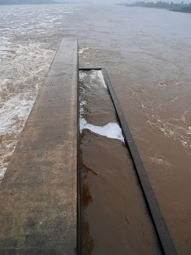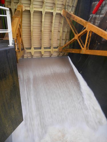 Il est impératif de respecter le parcours pour piétons qui est tracé sur la chaussée car des véhicules sons susceptibles de passer à tout instant. Mon guide me montre les portes de retenue d'eau par où évacuent les eaux du lac (ci-dessous) dont le niveau d'eau est situé trente mètres plus haut. Quelques autres chiffres permettent de mieux mesurer l'importance de cette usine hydroélectrique : 1 500 000 m3 de béton furent nécessaires à la construction de cet ouvrage qui est large de près de 900 mètres pour sa partie immergée (1,3 km au total). Le déversoir du barrage (partie centrale) est long de 361 mètres et comporte 19 vannes.
