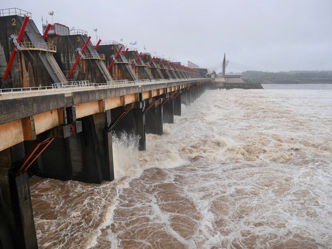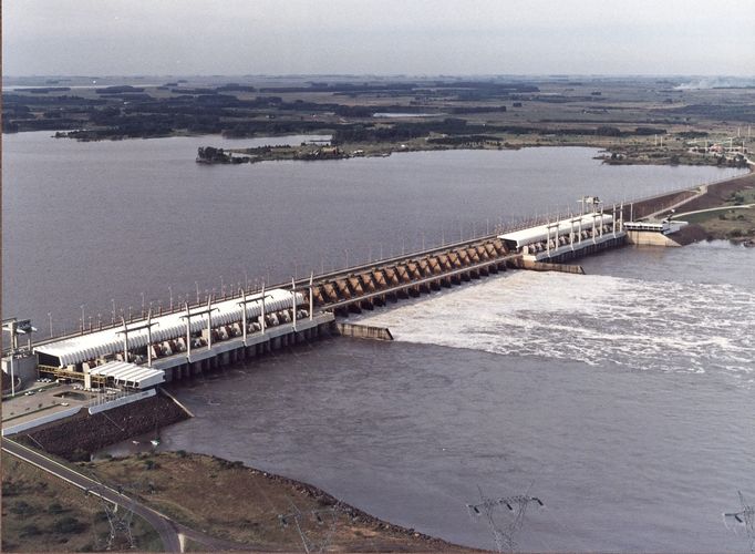 120 années s'écoulèrent entre le moment où un certain don Gregorio Soler présenta un premier projet de concession afin d'exploiter l'énergie hydroélectrique dans la région et l'inauguration de l'actuelle usine. Les travaux, eux, débuteront en 1974 et le lac de se former cinq ans plus tard, date correspond aussi à la mise en œuvre de la première des 14 turbines du barrage. Le dernier générateur électrique entrera quant à lui en fonction le 27 mai 1983. Situé dans le Ayui (qui signifie « l'eau qui court » en guarani), l'usine produit désormais une quantité d'électricité tout à fait satisfaisante, et sa production totale depuis 1979 a permis d'éviter de brûler 73 millions de tonnes de pétrole. Les travaux représentèrent à l'époque un gigantesque chantier au cours duquel furent utilisées 60000 tonnes d'acier tandis que 5000 ouvriers tant argentins qu'uruguayens participèrent au chantier.
