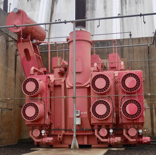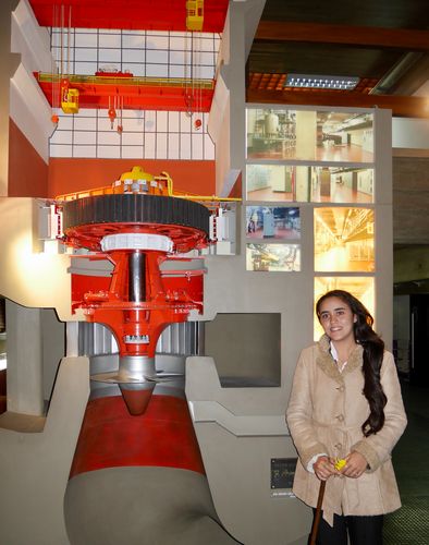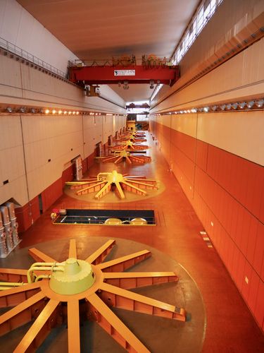 Le temps est brumeux en ce début de journée et ne m'aidera pas pour prendre des photographies. Qu'à cela ne tienne, je demanderai au service de presse, sur place, à ce me fasse parvenir un cliché aérien de cette réalisation uruguayenne et argentine. L'endroit est ouvert à la visite tous les jours de la semaine, de 7h00 à 16h00. Je me présente au point d'accueil où l'on m'informe que chaque visite débute par la projection d'un film de 20 minutes présentant le barrage. A l'issue de cette première étape, un guide nous explique quelques points particuliers sur l'histoire de l'ouvrage (fonctionnement d'une turbine par exemple) puis nous montons à bord d'un car qui va nous conduire à un point d'observation privilégié pour observer l'usine hydroélectrique de l'extérieur. A cet instant, le barrage relâche des millions de m3 d'eau emmagasinés dans la partie nord de la construction, c'est à dire par la retenue d'eau qui forme un lac de 783 km2, tandis qu'un courant résiduel se forme à la surface du fleuve sur plus d un kilomètre. Le car nous conduit ensuite sur le barrage d'où nous visitons la salle des machines (ci-dessous) qui renferme sept turbines servant à produire l'électricité. Une salle de machines est ainsi disposée à chaque extrémité du barrage qui totalise donc 14 turbines de 8,50 mètres de diamètre chacune, et d'une puissance de 187500 CV. Chaque turbine autorise le passage de 600 m3 d'eau par seconde. Chaque turbine est reliée à un générateur de 13,50 mètres de diamètre. L'électricité passe ensuite dans l'un des 24 transformateurs (troisième photo) pour augmenter la tension du courant et le rendre ainsi exportable. Les lignes électrique à haute tension à la sortie du barrage génèrent ainsi un courant de 15000 volts. Le barrage a une capacité de production de 1890MW et génère annuellement quelques 6640 Gwh, permettant de couvrir 7 % des besoins en énergie électrique de l'Argentine, et jusqu'à 50% de ces mêmes besoins en Uruguay (ce pays ne produit d'ailleurs que de l'énergie propre , qu'elle soit solaire, éolienne, hydroélectrique ou originaire de la biomasse). Une partie de la production du barrage est aussi vendue au Brésil.