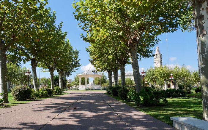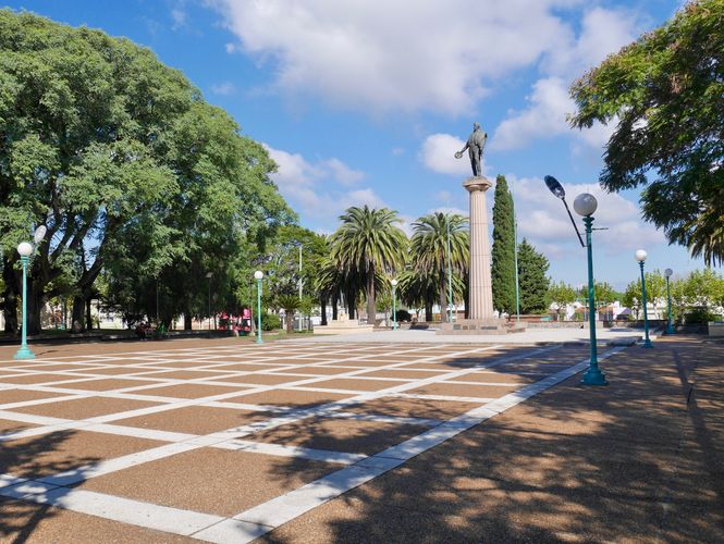 Nous l'avons vu plus haut, au départ, Fray Bentos portait le nom de Villa Independencia, jusqu'à obtenir le statut de ville en 1900. L'installation de Liebig sur le site aura certainement aidé la cité à grandir. Aujourd'hui, je découvre une petite ville fort sympathique avec ses quelques attractions : la place Artigas (ci-dessous) est la première place que je découvre en pénétrant dans cette agglomération qui fut classée patrimoine de l'humanité de l'UNESCO en 2015, sous la dénomination « paysage culturel industriel ». Le nom de Fray Bentos viendrait d'un certain Bentos, religieux ermite jadis installé dans un lieu connu aujourd'hui sous le nom de « Caracoles » (le long du fleuve Uruguay). On note en effet, à partir de 1600, l'existence du terme FrayVento. Pour le reste, le Capitaine Manuel de Ibarbelz, alors en voyage dans le Rio de La Plata, en 1692, mentionnait déjà les « ravines de Fray Bentos ». D'autres cartes, dont celle de la Compagnie de Jésus, viendront confirmer cette information.