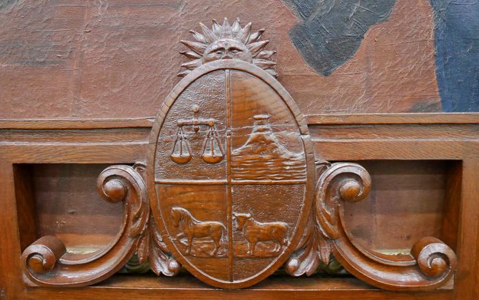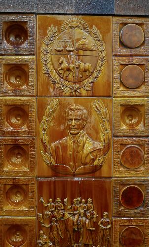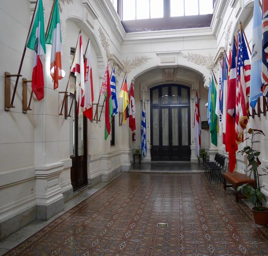 Dans le centre historique, Laura m'emmène à la découverte du Palais municipal, une des plus belles œuvres architecturales détenues par le département. C'est l'architecte uruguayen Alfredo Jones Browns qui en conçut la réalisation en 1902. Sur la partie supérieur de la façade, on peut lire Junta E.Administrativa, ce qui laisse à penser que l'endroit servit jadis de siège du gouvernement municipal. En pénétrant dans le vestibule, on peut trouver les plans de l'architecte, plans signés de sa main, ainsi que l'écusson de Florida, taillé dans le bois par Manuel Rosé, artiste plasticien. Ecusson sous lequel figure le buste du général José Gervasio Artigas. J'admire au passage les sculptures de la porte d'entrée, répliques exactes de l'originale. A l'intérieur du Palais existe une galerie exposant des drapeaux de plusieurs nations étrangères (ci-dessous), dont celles qui honorèrent la cité de leur visite. Notre pays en fait partie. La galerie débouche un peu plus loin sur le salon d'honneur baptisé du nom du premier intendant du département, le Dr Ursino Barreiro. Le palais fut autrefois utilisé comme siège de la direction départementale de Florida, jusqu'en 1973. Le mobilier est remarquable, comme, par exemple, un superbe fauteuil portant sur son dossier l'écusson gravé (deuxième photo) et un bureau en cèdre datant du début du XX ème siècle. Ces deux meubles ayant servi au Dr. Ursino Barriero. Le salon d'honneur offre également d'admirer un dessin à l'encre, oeuvre de Nin Gonzalez qui représente l'installation du gouvernement provisoire à Florida, un certain 14 juin 1825. Une peinture de Francisco José de Monino, représente le comte de Florida Blanca, à l'origine œuvre du peintre Francisco Goya y Lucientes. Autre toile, celle de Manuel Rosé, »L'assemblée de Florida de 1825 ». Les visiteurs peuvent enfin découvrir sur place une scène en faïence avec des hauts reliefs (troisième photo), œuvre de l'immigrant croate Djuro Jelacic. Sans oublier une belle horloge allemande, jadis importée par la firme Oscar Spangenberg & Co. A noter toutefois que la visite du Palais municipal fait partie d'un circuit organisé par l'office du tourisme.