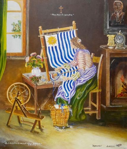 C'est le 27 janvier 1816 que sera créé par décret le département de Canelones, un des six premiers départements de la Province orientale de l'époque. Et la proximité de la ville naissante avec Montevideo de faire de l'endroit un centre politique d'ampleur historique. Canelones deviendra ainsi le siège de l'assemblée constituante, assemblée précédemment créée à San José le 22 novembre 1828. Et douze années plus tard, le drapeau national d'être conçu, ici, à Canelones, par l'assemblée générale constituante d'alors, placée sous l'autorité du gouverneur provisoire, Joaquin Suarez, en décembre 1828. On prétend que la femme de Joaquin Suarez serait à l'origine de la confection du drapeau (comme le suggère la peinture ci-dessous), mais aucune preuve n'a à ce jour été apportée. Natif de Canelones, Joaquin Suarez vit le jour le 18 août 1781, puis s'exerça au travaux ruraux, durant son enfance, sur les terres de son père. Il participera à la révolution, sera nommé commandant militaire de la ville, avant de devenir député de Florida en 1825, puis gouverneur délégué de la province entre 1826 et 1827. Notre homme ne cessera d'occuper des responsabilités nationales jusqu'à sa disparition en 1868.