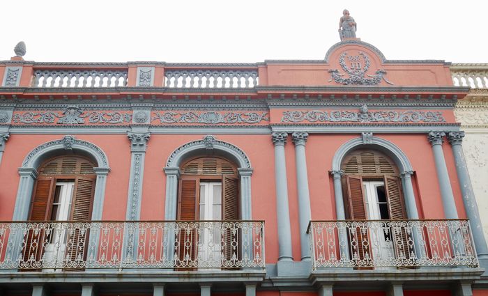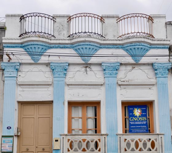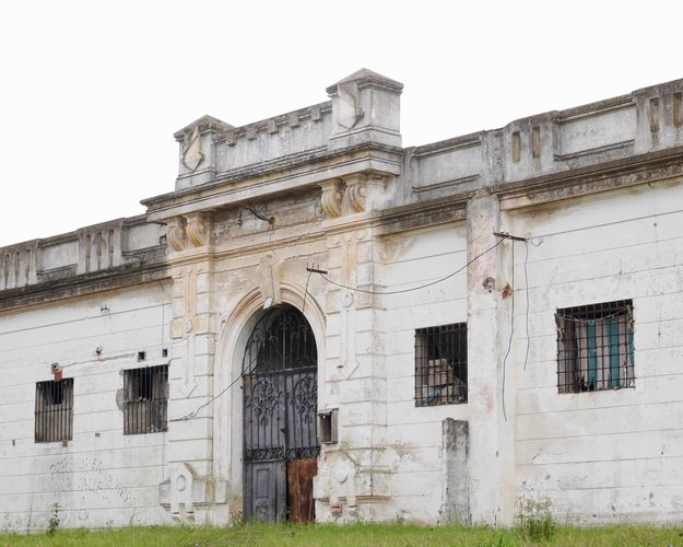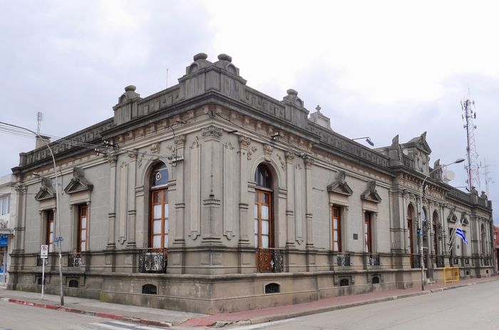 Livré à moi-même, je ne rencontrerai aucun panneau descriptif des monuments rencontrés lors de ce circuit N°1. J'observerai donc l'architecture des maisons, des constructions souvent basses bordant des rues pavées et parfois étroites, pleines de souvenirs des siècles passés. Les apports successifs de populations immigrées contribueront à enrichir la ville de nouveaux talents mais la cité ne disposera d'une certaine autonomie administrative qu'avec la création du département de Rocha au début du XIX ème. Mon parcours prévoit la découverte de plusieurs résidences comme celle de la famille Demichelli (ci-dessus) dans la rue 25 de Agosto, avec, en-dessous de l'appartement, la boutique. Cette dernière appartient désormais au passé. J'apprécierai beaucoup les façades colorées comme celle du centre social ouvrier, toute orange, ou encore cette façade bleue et blanche (deuxième photo ci-dessus) rencontrée dans la rue J.P.Ramirez. A titre d'exemple, en 1900, Rocha comptait 28 maisons particulières en construction dans sa rue principale, des demeures qui mobilisaient alors quasiment une centaine de personnes dans différents corps de métier. L'Etat uruguayen, lui, n'avait encore rien investi dans cette ville, si ce n'est les quelques travaux réalisés au profit de l'hôpital de charité en 1888, et elle se contentait de louer les locaux qui lui étaient parfois nécessaires. Il faudra attendre l'arrivée de Juan Lindolfo Cuestas au pouvoir pour que Rocha reçoive une première somme de 50000 pesos pour bâtir plusieurs bâtiments publics dans le département. C'est ainsi que la prison départementale (ci-dessous), le Palais municipal (deuxième photo), un premier commissariat de police, une première école et le théâtre Escuela Ramirez verront peu à peu le jour.