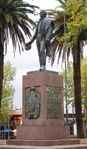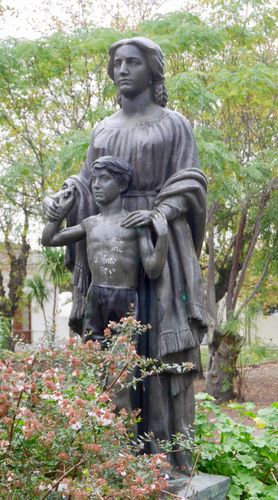 Mon circuit prévoit la visite de plusieurs paseos (promenades) dont celui du Candombe, qui va de la Place de l'Indépendance à la Place Pedro Lapeyre. Le principal intérêt de cette balade réside dans les peintures murales (ci-dessous) qui ornent certaines façades de maisons, et représentent des scènes de la vie locale. Celui met un peu de couleur dans cette grisaille hivernale. La place Pedro Lapeyre (jadis appelée Place des lavandières) ne me fera pas très bonne impression mais elle est pourtant la plus ancienne du genre à Rocha, puisqu'elle apparaît sur le premier plan de la ville tracé par Pedro Douguet, arpenteur, qui oeuvrera ici vers 1870. Cette place présente pourtant un intérêt culturel d'importance car y convergent à la fois des personnages, des légendes, le carnaval, la musique et la fête. Force est de constater que la joie ne domine pas aujourd'hui. D'ailleurs, je me méfierai des places de Rocha. Entre la Place de l'Indépendance où j'apercevrai une banderole de soutien à la révolution vénézuélienne de Nicolas Maduros et celle du Congreso de 1813, où je devrai retirer un pneu de vélo qui servait de collier à la statue de la mère et l'enfant (deuxième photo) avant de prendre un cliché de la pauvre femme, je me dis qu'on se préoccupe décidément peu de la mise en valeur du patrimoine dans cette ville.