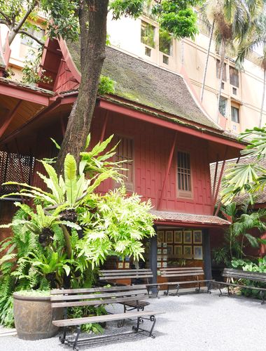 La maison en elle-même est formée de six bâtiments en teck, tous représentatifs de ce qu'il y a de meilleur dans l'architecture traditionnelle thaïlandaise. Certaines de ces maisons, qui provinrent pour certaines d'entre elles d'Ayudhya, auraient plus de deux siècles et auraient été démontées pour être rebâties à l'emplacement actuel, sous l'oeil attentif de Jim Thompson, qui admirait le travail des artisans d'alors. Ces maisons, lors de leur reconstruction, furent surélevées au-dessus du sol, pratique courant en Thaïlande afin de se prémunir des inondations lors de la saison des pluies. Chaque maison est aussi munie d'un pas de porte surélevé, une technique astucieuse interdisant l'accès des enfants en bas-âge à l'extérieur de la demeure, mais également pour empêcher les animaux (comme les serpents) de pénétrer à l'intérieur. Le toit est quant à lui recouvert de tuiles représentant un dessin traditionnel rare et qui furent cuites à Ayudhya. La peinture rouge appliquée sur les murs extérieurs a subi un traitement destiné à protéger les murs anciens des intempéries. Des murs extérieurs qui furent remontés à l'envers afin de pouvoir profiter depuis l'intérieur de la demeure des frises sculptées sous les fenêtres. Plusieurs de ces fenêtres seront d'ailleurs condamnées , puis transformées en niches d'exposition de statues. A l'intérieur, seule concession à la modernité, des lustres très anciens venant du palais de Bangkok et datant des XVIII è et XIX è siècle furent installés tandis que chaque bâtiment fut construit au même niveau que son homologue (ce qui est rare dans ce pays) permettant à des corridors de relier les bâtiments les uns aux autres pour former un ensemble. Jim ne s'installa pas dans cette maison par hasard, mais au moment jugé le plus propice par les astrologues, en fonction des rites religieux, c'est à dire au printemps 1959.