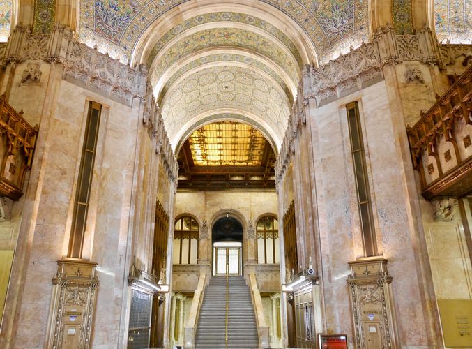 Woolworth Building, 233 Broadway, à New-York. Accès par métro sur les lignes 2 et 3, station Park Place, le métro E station World Trade Center, métro N et R, station City Hall et métro A et C, station Chambers Street. Horaires des visites guidées sur https://woolworthtours.com/et réservations au 203 966 9663.