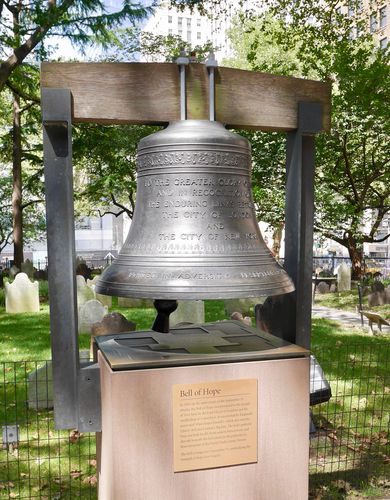 Dans ce même cimetière, on peut également admirer la cloche de l'espoir (deuxième photo). Celle-ci fut offerte à la ville de New-York en septembre 2002, par le Maire de Londres, en signe de solidarité à l'occasion du premier anniversaire des attaques du 11 septembre 2001. Elle sonne le 11 septembre de chaque année et pour d'autres occasions particulières. La cloche a été coulée à la fonderie de cloches de Whitechapel à Londres, la même fonderie qui coula la Cloche de la liberté et Big Ben.