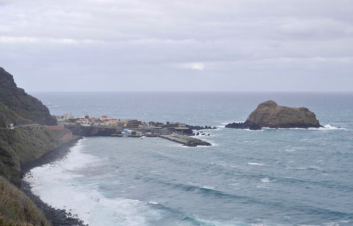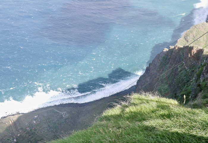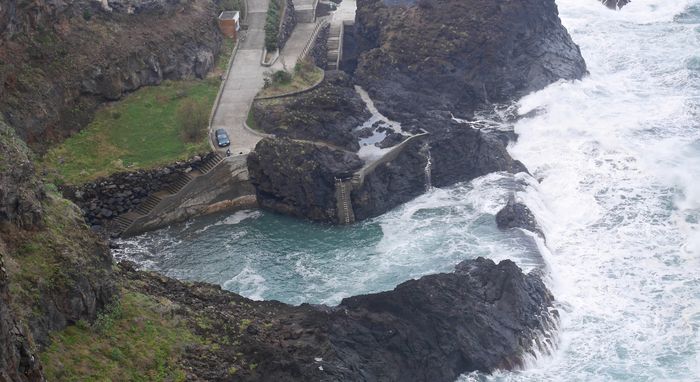 Alors que je cherchais à me rendre à Achadas da Cruz, mon GPS me fait prendre une route à ...20%. Et plus je grimpais, plus je craignais que mon véhicule se renverse, tant la côte était raide. Jusqu'au moment ou la route s'est rétrécie drastiquement. Je me suis alors décidé à rebrousser chemin, ayant trouvé un espace pour manoeuvrer et faire demi-tour. Je trouverai plus loin une route moins périlleuse mais toujours en lacets, montagne oblige. Achadas da Cruz n'est pourtant qu'un hameau mais ce qui m'attire là-bas est son téléphérique qui fonctionne depuis 2001 et relie le haut de la montagne au bas situé en bord de mer, via une descente vertigineuse. Ce moyen de transport est bien pratique, à commencer pour les paysans qui l'empruntent pour aller cultiver leurs terres côtières. Malheureusement, la tempête d'aujourd'hui n'autorise pas le fonctionnement du téléphérique et je devrais me contenter d'admirer la vue en contrebas et revenir un autre jour. Impressionnant !