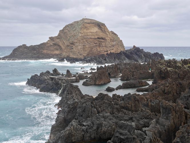 Autre ville de mon périple le long de la côte nord-ouest : Porto Moniz (ci-dessous). Il aurait fait soleil, je me serais bien baigné dans les célèbres piscines naturelles (deuxième photo) qui font la réputation de ce bourg longtemps resté enclavé mais la météo est aujourd'hui défavorable. Je trouve une place de stationnement gratuite et m'y gare sans attendre, en face de l'aquarium municipal. Cet aquarium a ouvert ses portes en 2005 dans l'ancien fort Saint-Jean-Baptiste qui fut érigé en 1730 pour protéger le port de l'attaque des pirates. A l'intérieur, onze bassins ont été aménagés afin d'accueillir un échantillon de la faune qui peuple les eaux madériennes, depuis l'anémone violacée jusqu'à la vilaine rascasse. Soit 70 espèces au total classées selon leur habitat. Le bassin central reste toutefois le plus fascinant avec ses raies qui évoluent sous nos yeux. Quant au dédale de bassins naturels remplis à marée haute par la houle, il reste l'attraction majeure du village. Nombreux sont les habitants de Funchal à se déplacer l'été pour s'y baigner.