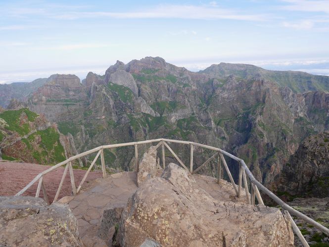 Le Pic do Arieiro, lui, se situe à 1816 mètres d'altitude et est le troisième sommet de Madère. L'endroit est grandiose et la lande frissonne sous le vent. Les nuages se sont dispersés à temps et le soleil fait des apparitions accompagné de ciel bleu. C'est alors un panorama à 360° qui s'offre à nos yeux, avec notamment une vue plongeante sur Curral das Freiras à l'ouest. A droite du pic se profile le sommet déchiqueté des grands pics, avec le Pico das Torres, qui masque presque le Pico Ruivo (surnommé le pic Roux et situé à 1861 mètres d'altitude), point culminant de l'île. Au nord, on aperçoit le rocher de l'aigle. Il est par contre dommage que ces informations ne soient pas disponibles sur place pour les visiteurs. Un panneau existe bien mais la carte a été depuis le temps brûlée par le soleil. Seules quelques boutiques de souvenirs, des toilettes payantes (0,50€) et la station radar de l'armée de l'air portugaise occupent la place.