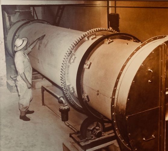 Une pièce du musée a été reconstituée pour reproduire un atelier de dépeçage des cétacés, avec la présentation des outils utilisés à l'époque. On y observe notamment un séchoir à viande (ci-dessous), dont on nous explique que la viande de baleine, une fois cuite dans les autoclaves puis pressée pour en éliminer l'excès d'eau, était séchée dans un séchoir à tambour rotatif, grâce à la chaleur de la vapeur d'eau libérée à l'intérieur du séchoir par un réseau de tubes, qui renvoyait ensuite l'eau froide vers les chaudières.