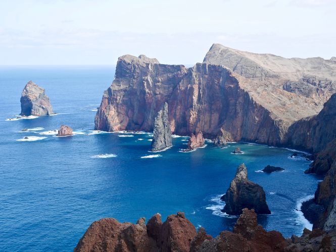 En sortant du musée de Caniçal, je poursuivrai ma route jusqu'au Ponta de Sao Laurenço (pointe de Saint-Laurent), qui constitue l'extrémité nord-est de l'île de Madère. Il s'agit d'une presqu'île déchiquetée par les vents du Sahara, qui ne laisse survivre qu'une végétation formée d'herbes folles et d'une trentaine d'espèces endémiques. Et un sentier de randonnée de sillonner ce désert improbable. Autre curiosité locale, la Prainha do Caniçal, petite crique de sable noire blottie au pied de la chapelle Notre-Dame de Piété. En grimpant tout en haut de la montagne environnante, je m'arrêterai ici et là pour profiter de panoramas exceptionnels sur l'océan (ci-dessous).