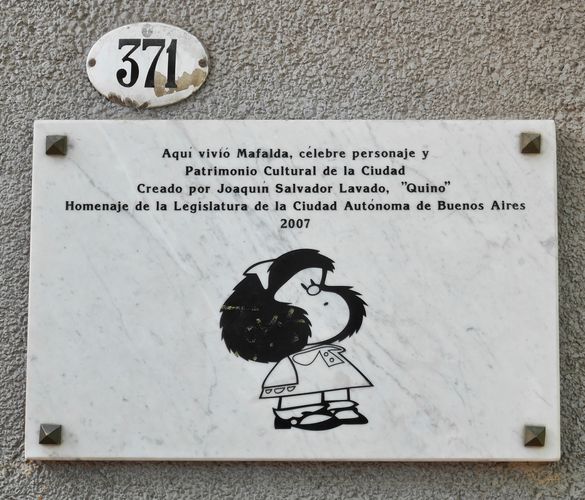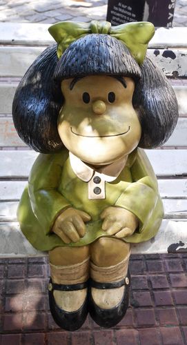 La sculpture de Mafalda, réalisée par l'artiste Pablo Irrgang, est assise sur un banc entourée de ses amis Susanita et Manolito. A quelques mètres de là, se dresse la maison de Mafalda, plus exactement au N°371 de la rue Chile. C'est en effet à cet endroit que Joaquin Lavado, dit Quino, et dessinateur de notre héroïne, vécut de longues années dans l'un des appartements de l'immeuble. Mafalda naquit de son coup de crayon en 1963 mais la première bande dessinée, elle, ne paraitra qu'un an plus tard, fin 1964, dans la mythique revue Primera Plana. Puis, en 1965, dans le journal El Mundo, avant de paraître en 1967 dans l'hebdomadaire Siete Dias. Ainsi Mafalda prospéra t-elle une dizaine d'années avant sa dernière parution le 25 juin 1973, cinq jours après le massacre de l'aéroport d'Ezeiza, le jour du retour d'exil du général Juan Peron.
