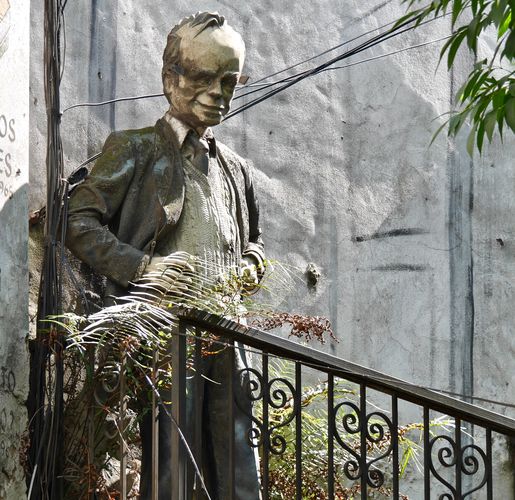 Au fond de la place portant son nom, s'élève une statue à son effigie depuis un faux balcon, entourée des titres de ses œuvres et des mentions de leurs années de parution. L'iconographie du personnage est complétée par une machine à écrire, une tasse de café noir et d'épaisses lunettes (deuxième photo). Quant à la place, elle fut restaurée à l'initiative du Secrétariat de la Culture de Buenos-Aires en 2009.