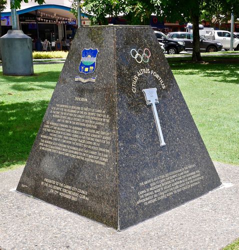 Une autre stèle, celle qui rend hommage aux JO de 1956, se trouve aussi sur l'Esplanade (en photo ci-dessous). Le monument symbolise le départ de la flamme olympique depuis Cairns. De là, la flamme se rendra jusqu'à Melbourne. Ces Jeux Olympiques d'été se tinrent en effet cette année-là en Australie et furent les premiers du genre à se tenir en Océanie. Ces Jeux seront officiellement lancés à l'époque par le Duc d'Edimbourg, Commonwealth oblige. Et la torche olympique fièrement portée par Ron Clarke. Melbourne avait alors remporté les Jeux face à Buenos-Aires (Argentine), Mexico City, Montréal et six autres villes nord-américaines également en lice.