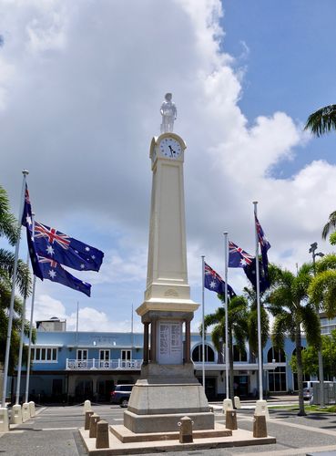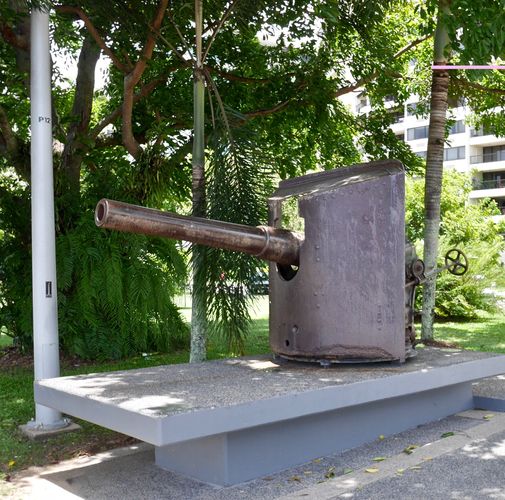 En poursuivant ma promenade sur l'Esplanade, j'aperçois bientôt le Cénotaphe de Cairns (ci-dessous), en mémoire aux soldats tombés lors de la première Guerre mondiale. Une plaque de marbre porte 142 noms gravés d'habitants de Cairns qui périrent lors de ce conflit, tandis qu'au sommet du mémorial se dresse la statue d'un terrassier et une horloge. A noter que ce cénotaphe rejoignit son site actuel en 1972. Au pied de ce mémorial, je remarque un canon mitrailleur (deuxième photo), canon réalisé par le département des transports ferroviaires de Woolwich (Angleterre) en 1887. Ce type de pièce d'artillerie fut largement utilisée par les Britanniques des années 1940 jusqu'aux années 1970.
