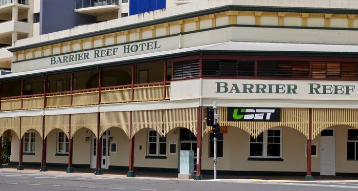 Quelques mètres plus loin, se trouve encore le Barrier Reef Hotel (ci-dessous) qui porta longtemps le nom d'Empire Hotel dès 1898. Il s'agit là d'un immeuble à deux niveaux bâti à l'origine pour des marchands de vins et spiritueux P.J Dayle, et qui fut érigé en 1926 à l'aide de béton armé, ce qui était novateur pour l'époque et très utile dans une région où sévissent les cyclones. L'endroit sera en partie réquisitionné par la Royal Air Force australienne durant la seconde Guerre mondiale, puis l'hôtel restera ensuite ouvert 24 heures sur 24 dans les années 1950, afin d'accueillir de nombreux ouvriers et employés travaillant sur le port et dans les plantations de canne à sucre environnantes. Curieusement, l'hôtel ne prendra son nom actuel qu'au cours des années 1960 afin de marquer sans doute l'importance croissante du tourisme local.