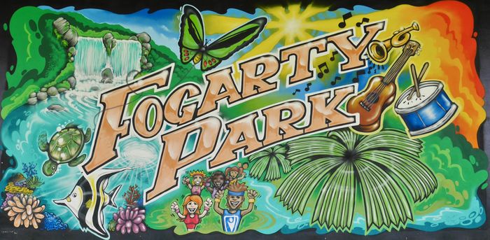 Juste en face, se trouve le parc Fogarty (en photo ci-dessous), baptisé du nom d'un homme d'affaires local et bienfaiteur, Sir Reginald Frances Graham Fogarty, ancien propriétaire de la North Queensland Brewery et membre du conseil municipal de Cairn et de la Chambre de commerce. Outre une scène ouverte aux artistes en tous genres, le parc est devenu un lieu de concerts sur l'esplanade depuis les travaux de réhabilitation effectués en 2003. Sur place se dresse encore une ancre de bateau (deuxième photo) qui fut repêchée non loin de là et qui symbolise le centenaire de la ville de Cairns en rendant hommage aux premiers navigateurs qui ont fréquenté la région. Cette ancre est placée près de l'endroit même où fut établi pour la première fois le port de Cairns le 6 octobre 1876.