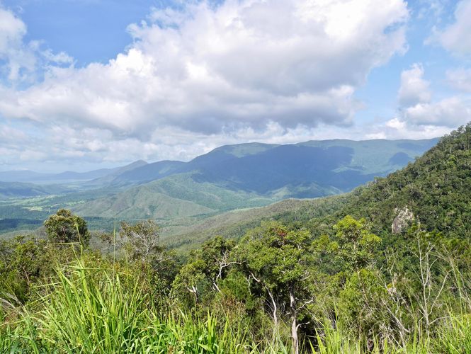 Le moins qu'on puisse dire est que, pour ce séjour australien, j'ai cette fois choisi la ruralité. Et de délaisser les sites touristiques connus pour partir au contraire à la découverte de l'arrière-pays, l'Outback du Queensland. Fidèle à la tradition, je fais le plein de victuailles dans un centre commercial de Cairns puis je prends la route en direction de Mount Surprise. Le GPS s'occupera de me guider sur les 313 kilomètres qui me séparent des deux villes et commencera par m'imposer une route sinueuse avec des virages à n'en plus finir et une vitesse réduite par endroits à 40 km/heure. Le paysage est magnifique et verdoyant compte tenu de la basse saison actuelle et des pluies qui arrosent par intervalles le vaste Etat. Les panoramas sont rarissimes à cet endroit mais je ferai une courte halte pour celui de Heales (en photo ci-dessous) qui témoigne de l'altitude franchie tout au long des cent premiers kilomètres.