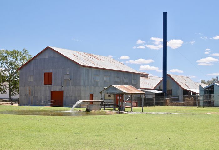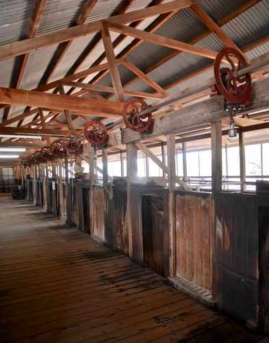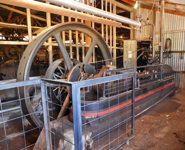 Sue m'a fait part de l'existence de l'unique station de traitement de la laine fonctionnant à la vapeur encore visible en Australie, la Blackall Woolscour (ci-dessous). Celle-ci se trouve un peu à l'écart de la ville, à quatre kilomètres de là. Ce musée nous fait remonter au temps des pionniers, alors que la petite usine fonctionnera entre 1908 et 1978 à l'aide d'un moteur de 45 chevaux (ci-dessous) mu par la vapeur. Deux fours, un anglais puis un australien, étaient alimentés de bois et réchauffaient l'eau jusqu'à dégager la vapeur nécessaire. Je suis surpris par l'entretien impeccable de ce moteur qui est mis en fonctionnement tous les mois, et bien sûr en haute saison touristique pour le plus grand plaisir des visiteurs. D'entrée, mon guide me montre une source qui coule abondamment et m'informe que cette eau provient d'une nappe souterraine. Un puits, qui fut creusé en 1906, à une profondeur de 790 mètres, permet depuis à l'eau de remonter seule à la surface et de sortir à une température de 58°C. A l'intérieur, je découvre les postes de tonte (troisième photo) où les tondeurs s'installaient avec leurs moutons.