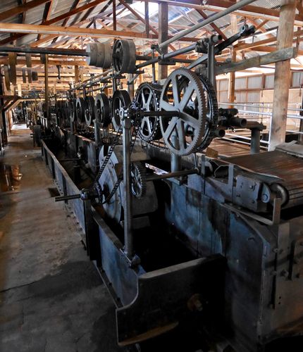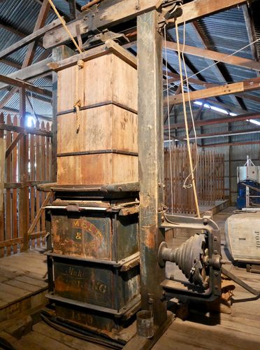 Plus loin, j'observe une compacteuse à laine (ci-dessous) qui permettait d'entreposer la laine sous la forme de ballots, afin de gagner de la place. Puis le guide de m'expliquer le fonctionnement des deux chaines de lavage de la laine (deuxième photo). La première chaine est d'origine anglaise et permettait le traitement du produit (lavage et séchage) en une heure. La deuxième chaine, plus récente, et de conception australienne, permettait la même opération en 45 minutes et offrait une capacité double par rapport à la première machine. En fin de chaine se trouvait le séchoir à laine (troisième photo) qui requerrait 35 minutes pour boucler l'opération. La laine séchée était ensuite conditionnée en ballots, eux-mêmes entreposés dans des trains. Aujourd'hui, cette unité de traitement ne fonctionne plus mais a le grand mérite d'avoir été restaurée en 1989, à l'initiative de l'association d'histoire de Blackall. A l'époque, cette méthode de lavage de la laine avait été mise au point dans les années 1890 pour remplacer la méthode traditionnelle consistant alors à contraindre les animaux à prendre un bain dans la rivière jusqu'en 1840. Puis, à partir de cette date, on lavera la laine manuellement à l'aide d'un savon fabriqué à base de graisse de mouton et de soude caustique. Les années 1890 permettront de découvrir le lavage mécanisé qui se démultipliera un peu partout à cette époque (on relevait l'existence de douze stations similaires dans le seul Queensland). Le bon fonctionnement de l'usine dépendait alors de trois facteurs : la bonne gestion du site, une alimentation en eau suffisante (l'eau devait être à une température minimum de 52°C pour permettre la bonne dissolution des graisses) et une desserte par rail (le train, qui arrivera à Blackall vers 1905 facilitera les choses).