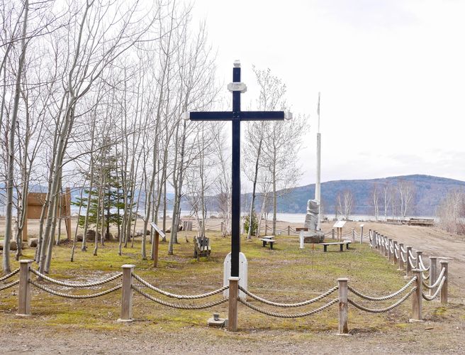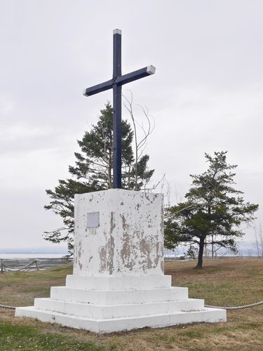En descendant du traversier à l'Isle aux Coudres, tourner immédiatement à droit puis suivre le Chemin du mouillage jusqu'à atteindre une croix (Cimetière des Français et Parc Jacques Cartier)