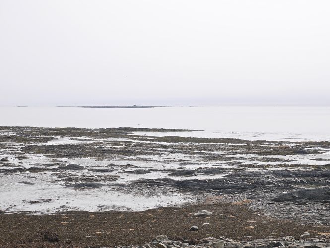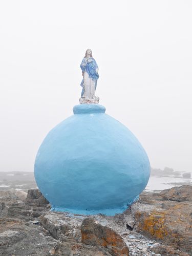 Je me dirige maintenant vers la Pointe du bout d'en bas. Là se dresse une statue de Notre-Dame de l'Assomption (ci-dessous) érigée à cet endroit en 1960, en remerciement pour la guérison d'un insulaire, Horace Pedneault. En regardant bien, je découvre un marsouin sculpté dans un rocher faisant face à cette statue. L'endroit est étonnamment calme en cette matinée brumeuse.