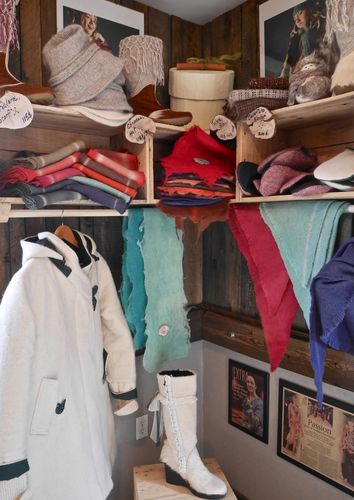Saint-Fulgence abrite également l'économusée Chevrier du Nord, qui élève des chèvres angora dont on retire le mohair, un poil servant à la fabrication artisanale de vêtements, d'après des méthodes anciennes. Annie me reçoit dans son entreprise qui existe depuis 2000, et me vante les qualités extraordinaires de cette fibre à la fois naturelle, soyeuse, lustrée, résistante et trois fois plus chaude que la laine. Une visite sur place permet d'observer toutes les étapes de fabrication des produits, qu'ils soient tissés, feutrés ou tricotés, en incluant le foulonnage et la teinture. Un petit tour dans l'enclos me permet de découvrir la chèvre angora, originaire de l'Himalaya, qui fut d'abord élevée dans la région d'Ankara durant le 13è siècle et dont la laine était déjà utilisée par les sultans de l'époque pour orner leurs vêtements. Longtemps gardée jalousement, la chèvre angora ne franchira les frontières qu'à partir du 19è siècle, pour n'arriver au Québec qu'en 1976 (on y compte aujourd'hui une trentaine d'éleveurs). A l'intérieur de la grange, je découvrirai des mâles en train de s'alimenter de foin, puis, juste à côté, quelques chevreaux chez lesquels j'éveillerai une certaine curiosité. Je dois reconnaître que ces bêtes sont très douces et sociables. Il est vrai qu'elles sont habituées à rencontrer beaucoup de visiteurs, notamment lors de la haute saison touristique. Le petit musée décrit avec précision les outils et les différentes façons de traiter la laine : au Chevrier du Nord, c'est l'étoffe qui donne le ton à la création des vêtements et des accessoires, qu'ils soient issus du tissage (entrecroisement de fils), du feutre (étoffe non tissée obtenue par le pressage des fibres trempées dans l'eau chaude et froides puis battues), ou du tricot (entrelacement d'une ou de plusieurs fils). Chaque étape est aussi replacée dans son contexte historique et l'on apprend beaucoup de choses en lisant attentivement les panneaux exposés.
