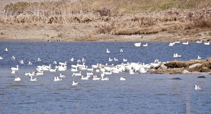 Bien que la majorité de ces oies choisissent d'hiverner dans des contrées plus chaudes (aux Etats-Unis), certaines passent l'hiver dans les régions enneigées du sud du Québec, sur un plan d'eau douce qui ne gèle pas pour s'abreuver, s'alimenter et se reposer. Les battures, ces vastes marais saumâtres qui bordent ici la rivière Saguenay, constituent un milieu de transition entre habitats aquatique et terrestre de ces Zico (zone importante pour la conservation des oiseaux) qu'on trouve au Québec dans une centaine d'endroits. La Zico de Saint-Fulgence rassemble à elle seule plus de 270 espèces d'oiseaux, 175 espèces de plantes et 53 espèces de poissons. Durant l'été, l'endroit est utilisé pour nicher, et comme refuge en automne et au printemps. Muni d'un téléobjectif, j'arriverai à prendre plusieurs clichés de ces splendides oiseaux blancs au vol majestueux.