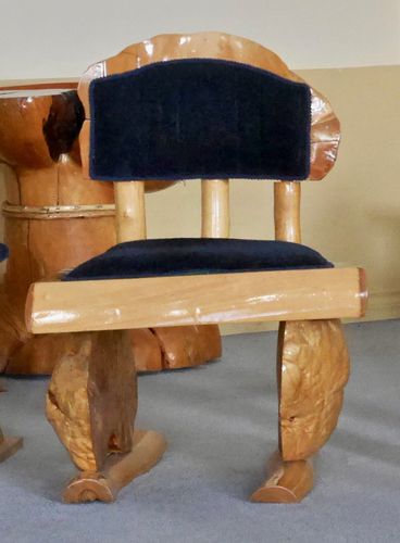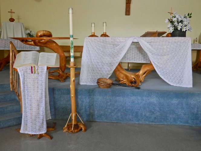 La rue du Quai, qui est en réalité en cul de sac, me conduit à l'église du village : avant que ne soit construit l'édifice religieux, les services du culte étaient offerts par des missionnaires. Et l'abbé Louis-Wilbrod Larabé, alors curé de Saint-Alexis de Grande Baie, d'assurer un service régulier dans le village des années 1880 à 1901. Deux ans plus tard, l'église actuelle était enfin inaugurée et dédiée à Sainte Rose de Lima. En fait, la construction de cette église est une œuvre de recyclage et de réutilisation dans la mesure où une partie des matériaux proviennent de la démolition d'anciens bâtiments de la Price Brothers & Company Ltd de Chicoutimi. La cloche, elle, se trouvait auparavant à La Malbaie tandis que l'autel faisait partie autrefois du mobilier de la cathédrale de Chicoutimi. En 1915, l'édifice religieux sera doté d'un choeur et d'une sacristie, et, dans les années 1960, le curé Joseph-Antonin Simard, fera le choix d'un mobilier entièrement constitué de pièces de bois puisées dans la forêt environnante. Le nouvel autel (ci-dessous), qui sera inauguré en 1965, reste certainement le moins couteux des autels puisqu'il n'aura couté que...12,80$. De plus, il attire un grand nombre de visiteurs de par son originalité. Entre temps, la petite église sera complètement détruite le 22 mai 1982 par un incendie. Et les paroissiens d'accourir pour sauver collectivement le précieux mobilier toujours visible aujourd’hui. Bravo à vos ouailles Monsieur le curé !