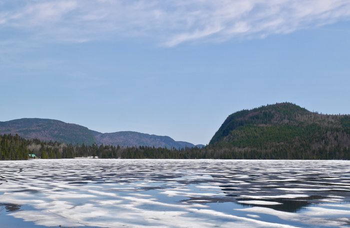 Je prends la route pour Tadoussac après un bon petit déjeuner au Café du Presbytère. Les médias annoncent une superbe journée sur le Québec et une température (caniculaire) de...24°. Il est vrai que les Québécois ne sont pas habitués à cela en cette période l'année. Le pays sort tout juste de l'hiver et les lacs sont toujours en cours de dégel (en photo ci-dessous, le lac Résimond, encore sous l'emprise des glaces).