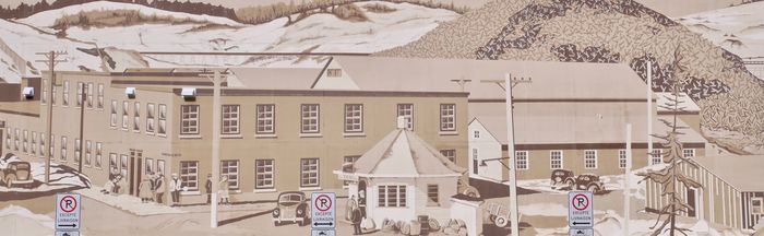Et le projet de redémarrer en 1934, puis, deux ans plus tard, l'usine de pâte à papier commence à prendre forme. Le quai de Baie Comeau est remis à neuf, et la petite ville naissante est alors réservée aux travailleurs de la Quebec North Shore Company. Les hommes vivent alors dans des camps temporaires érigés le long de la baie et sur la route du quai. Cette main d'oeuvre est toute trouvée pour participer à la construction des premières habitations destinées aux familles permanentes et aux commerçants. La compagnie apportera aussi un soin particulier au recrutement de son personnel dont on attendra qu'il s'adapte dans une communauté isolée. En 1938, un premier recensement comptera 80% de Canadiens français, le reste de la population se composant de cadres et d'ouvriers spécialisés anglophones venus pour la plupart de Thorold. Et la majorité des premiers résidents de Baie Comeau d'habiter sur l'avenue Champlain. Bientôt apparaît la première artère commerciale La Salle, appelée aujourd'hui Place Lasalle. En 1938, apparaît le premier hôtel du centre ville (actuellement Grand Hotel), qui sera détruit par le feu en 1944, avant d'être reconstruit et de porter successivement différents noms. Non loin de là, un édifice, le département du bois, abritait autrefois la direction des opérations forestières. Un gérant veillait ainsi sur le bon fonctionnement de toute la chaine de production de la pâte à papier. Sur ce qui s'appelle désormais la place de la biosphère, je note la présence d'un grande fresque dépeignant l'endroit (ci-dessous)
