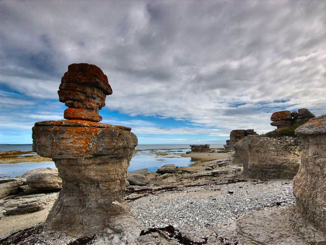 En discutant avec des habitants, j'apprendrai que la saison touristique sur cette froide Côte-Nord se résume à seulement quelques mois (de mi-juin à fin septembre) car la neige revient ici dès le mois d'octobre. Sous un soleil radieux, j'observe au loin les îles du parc national de l'Archipel de Mingan, l'un des quatre parcs nationaux du Canada situés au Québec. On y voit un chapelet d'îles calcaires au large du Havre Saint-Pierre et en face de l'île d'Anticosti. Là, se dressent d'étranges monolithes aussi surnommés « pots de fleurs » (ci-dessous) et une végétation de type boréal. Quant aux eaux entourant ces îles, elles offrent à la fois une intense vie marine et de nombreux oiseaux, dont la macareux moine (deuxième photo) qui niche sur certains îlots.