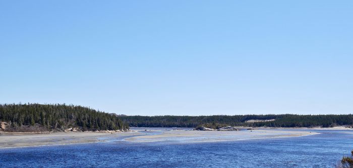 Cette promenade en forêt en période estivale est très agréable et les rivières qu'on y rencontre sortent de l'ordinaire. La rivière Manitou se trouve à une vingtaine de kilomètres du village de Sheldrake, le village de Rivière au Tonnerre se trouvant encore huit kilomètres plus loin, sur la même route. J’aperçois bientôt le pont Touzel, un pont métallique qui me laisse entrevoir la rivière Sheldrake (ci-dessous) sur ma gauche, et le Saint-Laurent (la mer, comme disent certains, ici) sur ma droite. Il est apparemment possible de remonter la rivière sur plusieurs kilomètres afin d'observer de superbes chutes d'eau, d'où l'utilité de partir avec son canot sous le bras.