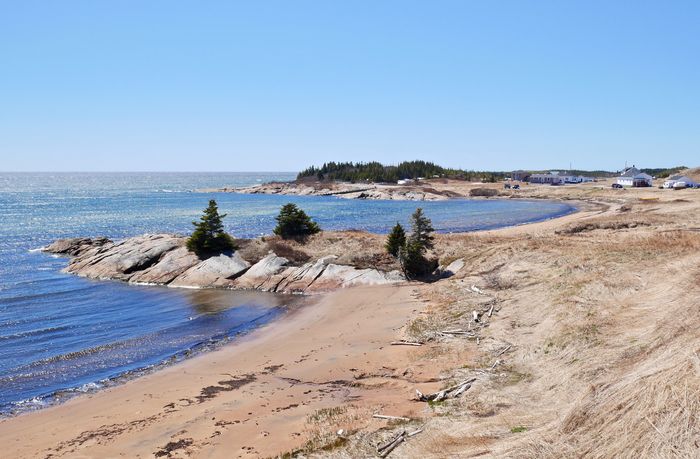 Le vent est sibérien, et souffle en tempête. Heureusement que le froid conserve. Je traverse bientôt Aguanish, qui signifie petit abri en langue innu. De là, je peux entrevoir de longues plages de sable blanc et la rivière du même nom. Qu'il doit faire bon ici l'été. Le cours d'eau est fréquenté par les pêcheurs de saumon et le village est le point de départ d'excursions permettant d'admirer un phénomène géophysique appelé « Trait de scie », un petit canyon. Plus à l'est, et à quatre kilomètres de là, je traverserai l'Île Michon, avec ses petites baies et ses charmantes îles (ci-dessous) où les randonneurs s'adonnent à la pêche aux mollusques.