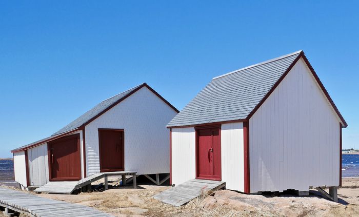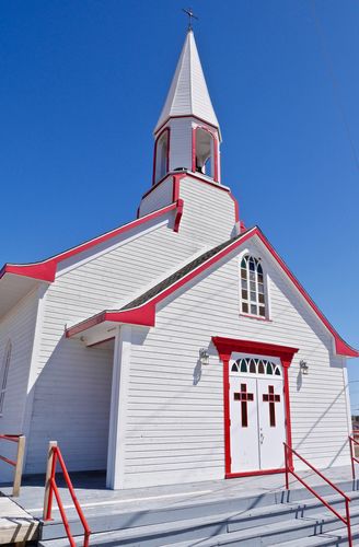 J'atteins bientôt Natashquan, ma destination finale, après avoir sillonné les derniers kilomètres sur une portion de route en lacets. Avec l'installation de Champlain à Québec en 1608 va débuter une course à l'exploration des Grands Lacs à l'intérieur du continent, au point d'en oublier la Côte-Nord et le Labrador. Il faudra attendre 1661 pour qu'un commerçant de fourrure de Québec, François Bissot de la Rivière, redécouvre le Labrador et ouvre un poste de traite à Natashquan (qui signifie « le lieu où l'on chasse l'ours »). A l'origine, Natashquan était fréquenté par les Innus, jusqu'à ce que les Européens s'y établissent progressivement à travers des postes de traite, puis la pêche à la morue. Les pêcheurs acadiens, en provenance des Îles de la Madeleine, assommés fiscalement, débarquent ici pour s'y installer définitivement. Parmi ces familles on trouve des Vigneault, des Cormier, des Chiasson ou des Lapierre, suivi plus tard des Landry. La population vit alors de la pêche, de la trappe et du commerce des fourrures, grâce à un système de troc qui aidera les gens à survivre. Trois compagnies de pêche s'installent à Natashquan en 1857-1858, même si une seule, celle d'habitants originaires de Jersey, s'implantera véritablement au village. Au début, les habitants n'auront pas d'église, jusqu'à 1859, date de construction d'une chapelle. L'édifice est alors érigé par Hilaire Carbonneau, avec du bois récupéré lors du naufrage d'un gros navire chargé de planches sur le rivage proche. La première église, elle, prendra forme en 1898, juste avant l'arrivée des Pères Eudistes sur la Côte-Nord en 1903 (en photo ci-dessous). Un peu à l'écart du bourg, je pars à la découverte des magasins de galets de Natashquan (deuxième photo), des constructions qui servaient autrefois à entreposer les agrès de pêche, l'huile de loup-marin et différents autres articles liés à la pêche, ainsi qu'aux opérations liées au traitement du poisson. A l'origine, le galet est un piton rocheux d'environ cent mètres carrés de surface, surélevé de trois mètres au-dessus du niveau de la mer, et entouré d'eau uniquement lors des grandes marées ou durant les tempêtes. Les pêcheurs du village virent l'avantage qu'ils pouvaient tirer de construire ces petits bâtiments appelés magasins du galet ou « de la grave ». Au début du 20è siècle, Natashquan comptait plus d'une trentaine de ces magasins, à la fois sur le galet et sur la plage. Ils étaient alors entourés par des « étals » et des « vigneaux » qui servaient à trancher et à sécher la morue. Le temps n'arrangera pas l'affaire puisque la majorité d'entre eux disparaitront jusqu'à ce que soient préservées les constructions actuelles sous le nom de « galets de Natashquan ».