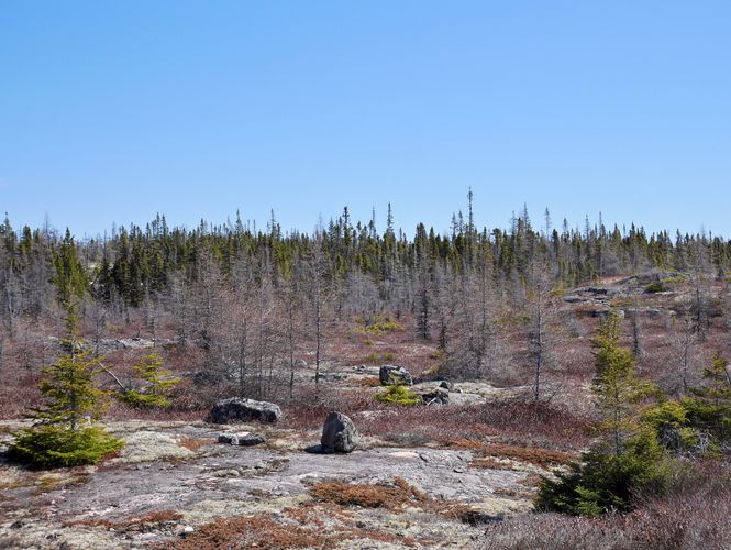 Parcourir la Minganie, c'est découvrir le pays boréal avec ses nombreux contrastes et la majesté de ses paysages. Celle-ci comprend deux sous-zones climatiques, la taïga et la toundra forestière, et deux domaines climatiques, la pessière à mousse et la sapinière à bouleau blanc. Les nombreux mélèzes et épinettes que j'aperçois sur une partie de mon trajet présentent une taille très compacte et une majorité de ces arbres atteint l'âge centenaire, voire 150 à 200 ans. Dans d'autres endroits, c'est la tourbière qui prévaut, des écosystèmes fragiles apparus il y a 8000 à 10000 ans qui offrent de nombreuses espèces biologiques hydrophiles comme le carex, les mousses, le nénuphar et quelques autres plantes insectivores. Une promenade à l'intérieur de ces tourbières permet d'apercevoir les pépites d'or de la Côte-Nord par champs entiers, des petits fruits à couleur de feu appelés chicoutés par les Innus qui s'en nourrissaient jadis, ou encore plaquebière (déformation du vieux français « plat de bièvre » ou « plat de castor »). Quant à la sarracénie pourpre, il s'agit d'une plante insectivore bien adaptée à la tourbière, une herbacée vivace de près de 35 centimètres avec de magnifiques fleurs rouge foncé et des feuilles adaptées à la capture des...moustiques. Le littoral, lui, ne serait pas ce qu'il est sans la présence de l'élyme des sables, graminée bleutée qui parsème les plages et les dunes sablonneuses et se plait à merveille dans les sols secs, en plein vent et dans les embruns.