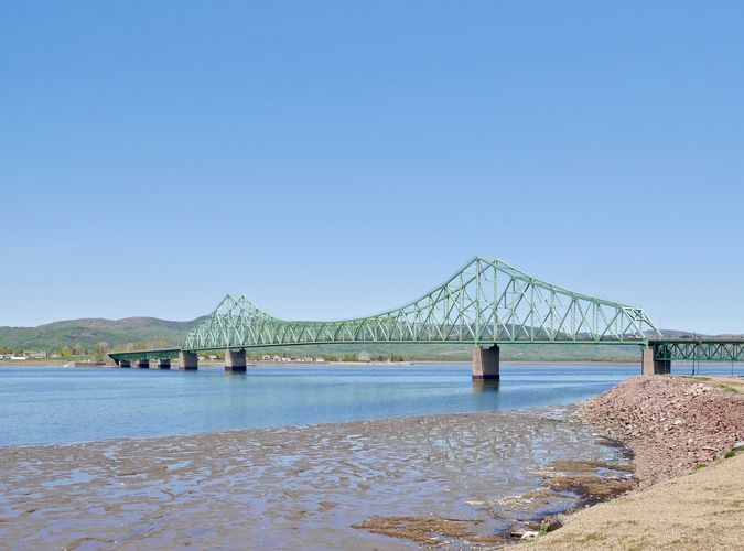 Je prends maintenant la direction de Pointe à la Croix, où les Européens débarquèrent pour la première fois vers 1620. Parmi eux, le Père Sébastien, missionnaire récollet qui évangélisera les autochtones de la baie des Chaleurs, c'est à dire les Micmacs. Et la mission de Ristigouche d'être créée près d'un siècle plus tard, vers 1750. Toutefois, l'arrivée des premiers réfugiés acadiens, cinq ans plus tard, va changer l'image de cette région qui sera longtemps occupée par une majorité d'habitants anglophones. Il est vrai que la province du Nouveau-Brunswick n'est qu'à trois kilomètres de là. Il suffit alors de franchir le pont JC Van Horne (ci-dessous) pour se retrouver à Campellton, le royaume de la pêche au saumon, d'après ce que laisse entendre une sculpture d'un saumon géant le long de....l'avenue du Saumon !