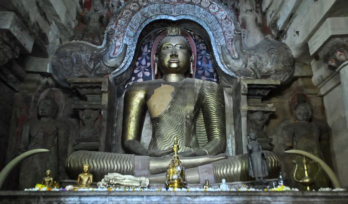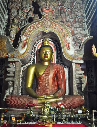 En face, se dresse le bâtiment principal actuellement en réfection. Il y a foule en ce dimanche car nombreux sont les Sri-lankais à fréquenter ce genre d'endroit ce jour-là. Deux éléphants gardent l'escalier menant au pavillon principal qui a pour caractéristique d'avoir été bâti en pierre de granit. Des sculptures de danseurs et de joueurs de tambour ornent aussi les murs extérieurs du pavillon et rappellent une tendance architecturale tout droit venue de l'Inde du Sud. Chaminda et moi entrons dans la niche principale en franchissant une jolie porte faite dans une même pièce de bois, l'ensemble étant décoré de peintures. Sur place, on aperçoit cinq statues de bouddha dans des positions différentes, dont celles de la méditation, du prêche et de la paix. En levant la tête, on observe le Makarathorana, une voûte avec la tête d'un diable au milieu, et des dragons sur les côtés. Autant d'images témoignant de l'influence hindoue et de celle de Pallawa sur le bouddhisme. La statue principale de Bouddha est quant à elle en granit plaqué or.