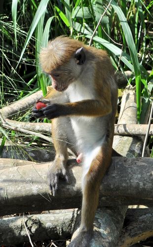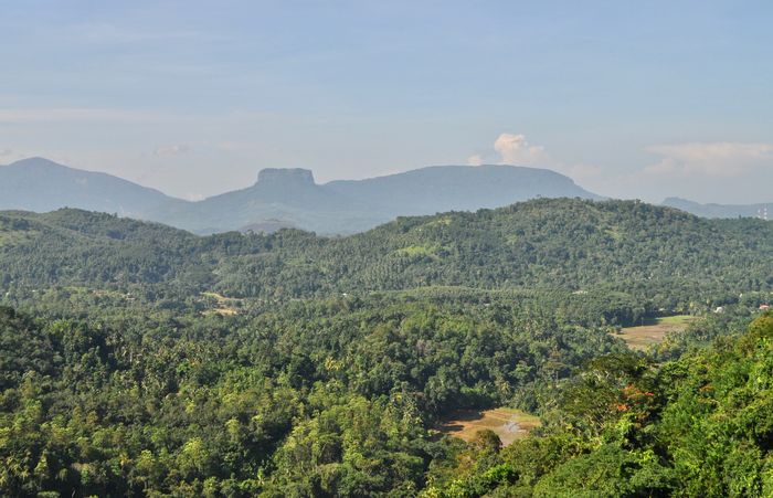 Chaminda passe me chercher à l'hôtel à 8h00 et nous quittons Pinnalawa et ses éléphants pour la région de Kandy et sa boucle des trois temples. Une heure de route nous sépare de notre destination, et l'occasion m'est à nouveau offerte de profiter du paysage. Alors que nous stationnons quelques instants afin d'admirer la vallée de Balana (en photo ci-dessous) et son célèbre rocher du lion, un macaque (deuxième photo) s'approche de nous, en tenant une fraise (gariguette?) entre les pattes. Sur la chaussée, un flot ininterrompu de véhicules en tous genres passe sous nos yeux.