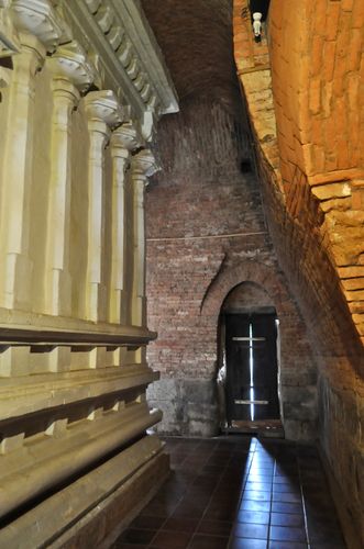 Au pied du temple se trouvent des inscriptions en langue cinghalaise et tamoul qui rendent hommage aux initiateurs de ce projet et aux rois qui ont rendu possible l'érection de ce lieu de culte. Pas moins de cinq divinités sont vénérés en ce lieu : Upulvan (dieu veillant sur le Sri Lanka), Ganapathi (aussi appelé Ganesh, et dieu de la réussite et de la sagesse), Saman (accompagnée d'un éléphant, cette déesse est l'une des gardiennes de l'île et du bouddhisme au Sri-Lanka), Vibhishana (ancien roi de Lanka dans la légende Ramayana) et Kumara Bandara (père de Veediya, commandant en chef du royaume de Kotte sous le règne du roi Bhuvanaikabahu VII de Kotte). Grâce à Chaminda, qui est ici connu comme le loup blanc, nous nous faisons ouvrir les portes du déambulatoire (ci-dessous) habituellement fermées. Cet endroit rassemble un temple hindouiste à l'intérieur même du temple bouddhiste de Lankatilaka Vihara. Et Chaminda de me rappeler qu'un temple bouddhiste est constitué de quatre parties : le stupa (qui contient des reliques de Bouddha), la maison d'images (qui offre des représentations imagées de Bouddha), l'arbre sacré bodhi (où l'on dépose ses voeux) et le monastère (qui abrite les moines). Le monastère du présent temple se trouve cette fois en contrebas du bâtiment principal et est dissimulé dans la végétation. Quant à la maison d'images de Lankatilaka Vihara, elle impressionne par ses peintures raffinées et colorées de bouddhas sur les murs et au plafond.