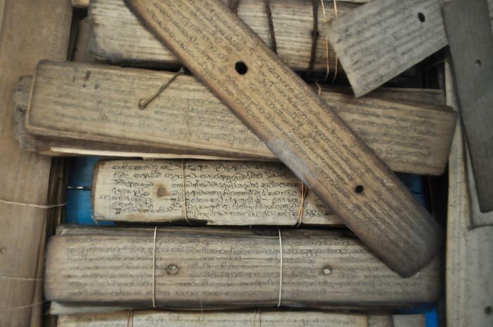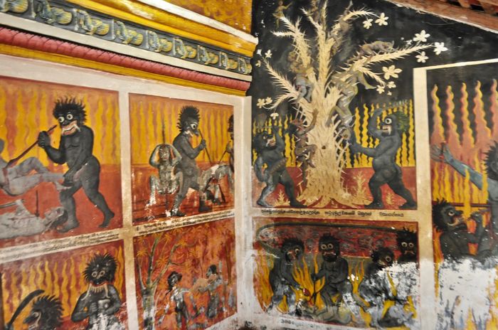 A quelques kilomètres de là, au nord de la ville se trouve le monastère d'Aluvihara, un ensemble monastique constitué de plusieurs petites grottes détachées de la montagne dont certaines sont ornées de fresques. SI l'on regarde au loin, derrière le monastère, on aperçoit un gigantesque bouddha doré perché à flanc de montagne avec, à sa base, des logements pour les moines. C'est à l'intérieur des grottes que, deux siècles avant notre ère, 500 moines transcrivirent sur des feuilles de tallipot (palmier) des textes bouddhiques (en photo ci-dessous) qui furent détruits par les Britanniques en 1848. Et un travail de restauration d'être actuellement mené afin de tenter de sauver ce qui peut encore l'être. Sur les trois grottes visitables, la principale rassemble un ensemble de peintures sur la vie de Bouddha. Sous la grotte repose un bouddha de dix mètres sous un plafond rocheux orné de fresques avec de jolis motifs floraux. Ce grand bouddha est entouré d'autres, plus petits, qui sont debout avec les paumes levées. Dans une grotte voisine, sont présentées des peintures illustrant diverses punitions (deuxième photo) contre l'adultère, la prostitution, les voleurs de temples, l'alcoolisme...Les diables ont ici la peau noire. Quant à la troisième grotte, plus petite, elle abrite une véritable chambre des horreurs où tous les châtiments de l'au-delà sont présentés par des mannequins grandeur nature. On dépèce, on scie, on arrache les corps. Ames sensibles, s'abstenir !
