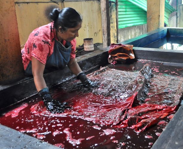 Chaminda me conduit maintenant dans un atelier de batik. Cette technique d'impression des étoffes est ici réalisée artisanalement et Matale figure d'ailleurs comme la cité sri-lankaise spécialisée dans cet art. L'idée consiste à dessiner sur le tissu un motif à reproduire, puis on protège les zones du tissu contre la coloration à l'aide de cire chaude appliquée avec un outil spécifique. On teint ensuite la pièce de tissu en la trempant dans trois bains successifs et l'on ôte la cire en faisant bouillir le tissu à une température de 100°C. Les origines du batik remontent à un peu plus de mille ans et ont donné lieu au développement de cette technique dans plusieurs pays d'Afrique et d'Asie (dont le Sri-Lanka). Le batik le plus élaboré est cependant javanais et a été inscrit en 2009 par l'UNESCO sur la liste représentative du patrimoine culturel immatériel de l'humanité. En fin de visite, nous nous rendons à l'intérieur de la boutique où nous découvrons des batiks de toutes formes, de toutes tailles et pour tous les goûts.