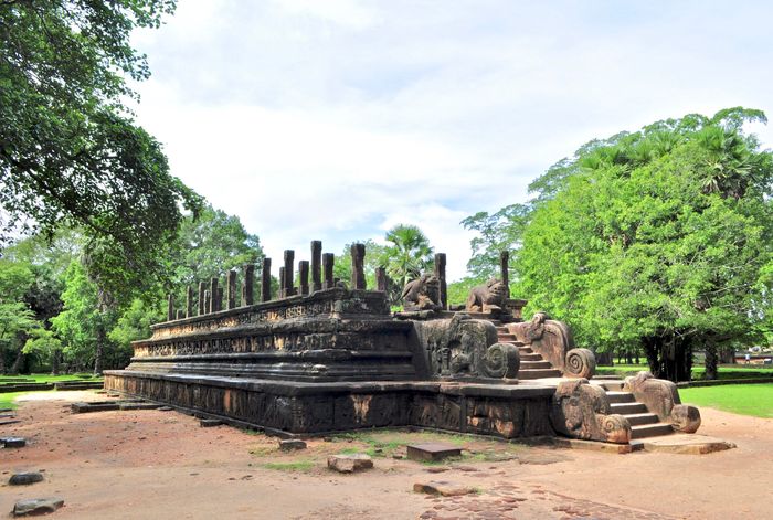 Nous débutons notre visite par un petit tour au musée d'archéologie, afin de comprendre ce qu'était la vie quotidienne dans cette ancienne ville médiévale tout en admirant de jolis bronzes chola dégagés du site lors des fouilles. L'ensemble des ruines de Polonnaruwa est rassemblé au sein du site archéologique situé au nord de la ville actuelle et il faut s'acquitter d'un droit d'entrée avant de pouvoir y pénétrer. Seules quelques parties comme l'Island Garden sont librement accessibles. Cet endroit se trouve à deux minutes à pied du musée et permet d'observer les ruines du palais que le roi Nissanka Malla se fera construire au bord du lac, à l'emplacement du jardin d'agrément de Parakramabahu. Chaminda me conduit à l'ancienne salle du Conseil (en photo ci-dessus), qui conserve encore son socle et ses piliers ainsi que le lion qui marquait l'emplacement du trône du défunt roi. Ce lieu de vie était fort bien conçu puisqu'un réseau de canalisations souterraines alimentaient les bains royaux en contrebas.